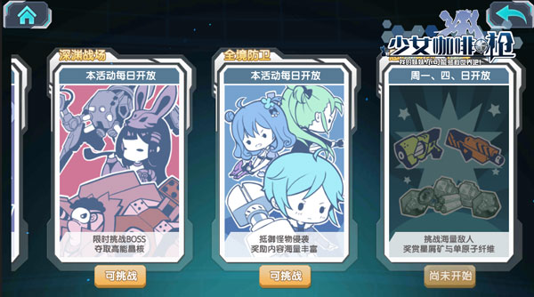 在全境防卫活动中,玩家需要进行阵容编辑。最多可以指派萌之屋的三名少女上阵并为其搭配装备,少女们的装备不能重复,到底宠谁?资源装备怎样分配?玩家可得好、好、选、择、哟!在战斗时,玩家只能操作一个少女,但可以手动切换成阵容内的其他少女,切换角色会产生2分钟的CD。萌之屋少女天团和你一起上阵打怪,助你早日登上人生巅峰!想挑战本店长吗?赶紧带上自家妹子一起闯关吧!