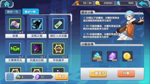 模块分解给予的碎片是购买价格的1/5,但是会返还几乎全部升级模块消耗的材料。