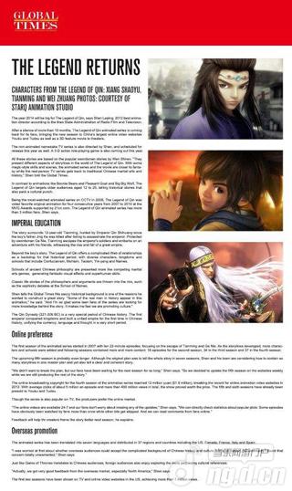 全球著名媒体《环球时报》的英文版日刊以整版全彩的页面对《秦时明月》进行了重磅报道,并赋予“传奇归来”这一美名。这部中国风动画佳作走出国门,将我们的本土原创动漫和传统文化带到国外,这款产品可谓是为我们国产动漫“长了脸”,这不仅涌现一批国外的秦迷,更一定程度上加大了《秦时明月》的品牌力量。