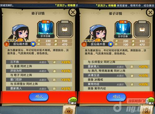 医仙端木蓉的回血技能“妙手回春”十分特别,开场即可令所有友方弟子进入“自愈”状态,当每次受到敌方伤害时便即时恢复大量的血值,具体回复的血量值与医仙端木蓉本身的血量、攻击数值以及技能等级等有关,“自愈”的暴击率则继承自医仙端木蓉。搭配医仙端木蓉,就能大大提高队伍里后排那些高攻击力、但弱防御力弟子的存活率。