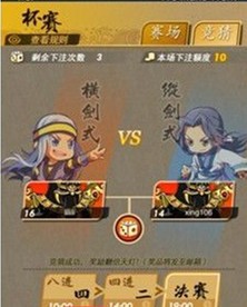 杯赛为全服皆可参与的PK玩法,玩家可于每天的8点到24点报名参加次日的杯赛,杯赛采取一场定输赢的淘汰赛制,紧张刺激,瞬息万变,赢得胜利更可获得海量的内力丹、天灯甚至是宝箱奖励。