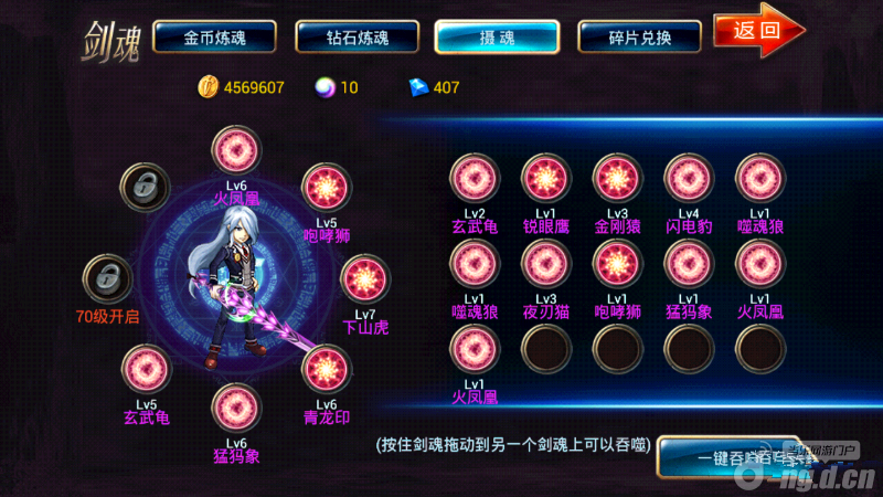 这个我比较强烈的推荐,没到四十级的话前三个剑魂绝防、绝攻、生命,不用放物攻、物防、暴击啥的。保证输出的同时还能保命,最好搭配了。当然能紫魂的,最好放紫魂(可以钻石抽,必出一紫),实在没有蓝魂也行(金币一键炼魂)。强化的最快方法,就是把你想要的魂摄取,然后剩下的魂一键吞噬,拿多次吞噬后的魂去喂你想升级的魂就好(有送的VIP就是方便啊)。