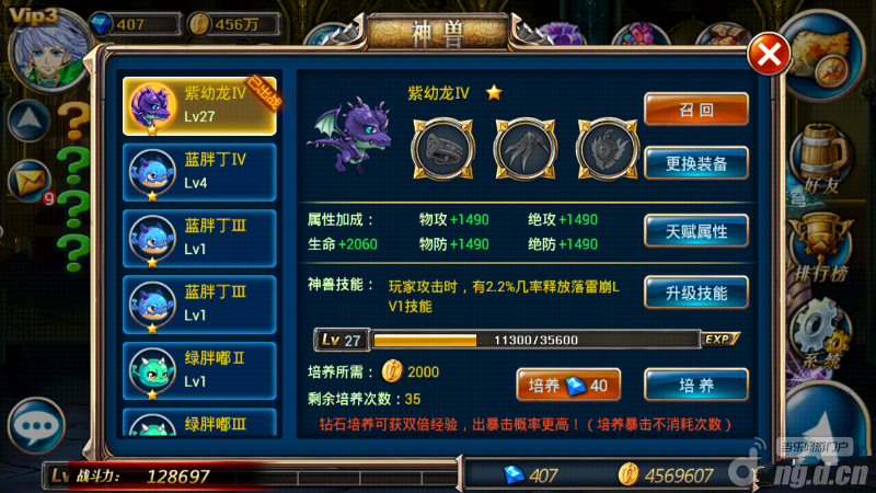 烧钱的玩意,但是增加的属性值很客观,建议装个回血的宠物(据说最好的是黑龙,但是我没抽到过啊啊啊啊),刷图的时候会有意外的效果哦~当然之后什么培养强化什么的,都是大家司空见惯的东西,就不赘述了。