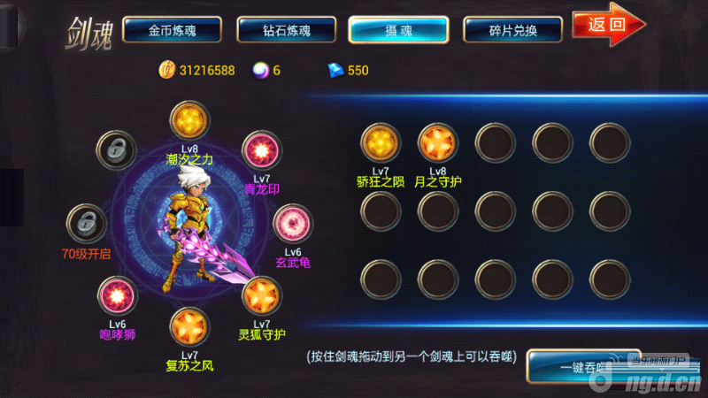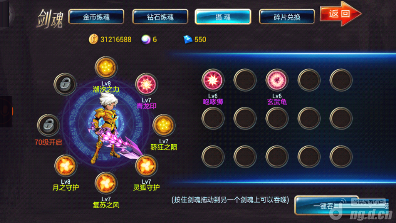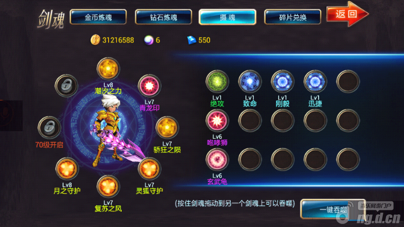 等级搭配剑魂,有的时候抽到高等级的剑魂时,可以稍微打乱原有的分配程序,但是在没有抽到高等级同属性剑魂的时候,千万不要把自己原有设定的剑魂吞噬掉,因为有的时候,有的地图,必须得用上某种剑魂才能通过。