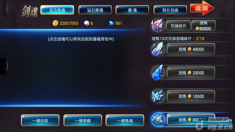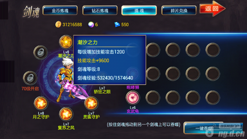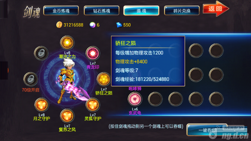 ⑤:升级剑魂等级循序渐进,不要只升一个,等级一起增加这样才能属性平衡,不要走极端。