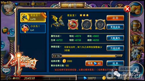 宠物的培养,每天会拥有35次的赠送培养机会(VIP可增加),其中分为金钱培养与钻石培养,钻石培养的数值是金钱培养的两倍,相应的也会高几率出现暴击培养的现象(金钱培养5倍经验数值)。