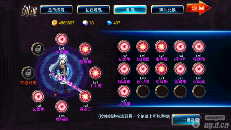 不用担心升级蓝色品质剑魂会浪费经验,剑魂的经验是可以完全传承的,只要吞噬掉有经验的剑魂即可。