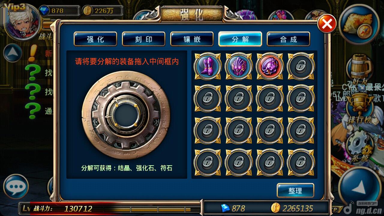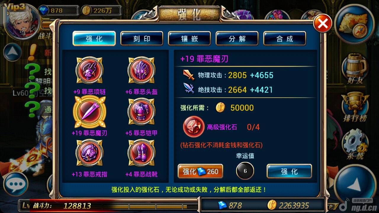 获得强化石开始强化了。先分析下剑魂的装备,武器加绝功绝防,戒指加绝功绝防,项链加物攻物防,盔甲加绝防物防,鞋子加物防,头盔加绝防,所以我们主要强化的重心就是武器,戒指,项链上,绝功物攻加战力高,而且实用性高,必须首选。在刚开始强化装备,建议把武器先强化到12级左右,这个不难的,成功率还是很高的。(不用担心,强化石分解装备会全部返还的。)