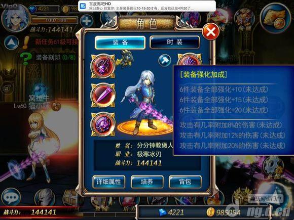 提示:强化套装只与装备的强化等级有关,和你穿戴什么类型的装备无关,也就是说你不需要一全套都是60紫,混搭的装备,只要达到强化等级就有强化加成。