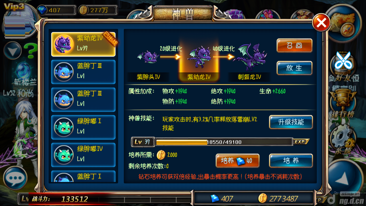 我也不多说什么,除了紫龙和黑龙,其他的真心不怎么样。宠物技能升级如果是加生命的话,那就不用浪费技能书升级了,触发率低,回的也少,如果是攻击技能可以考虑加几层。