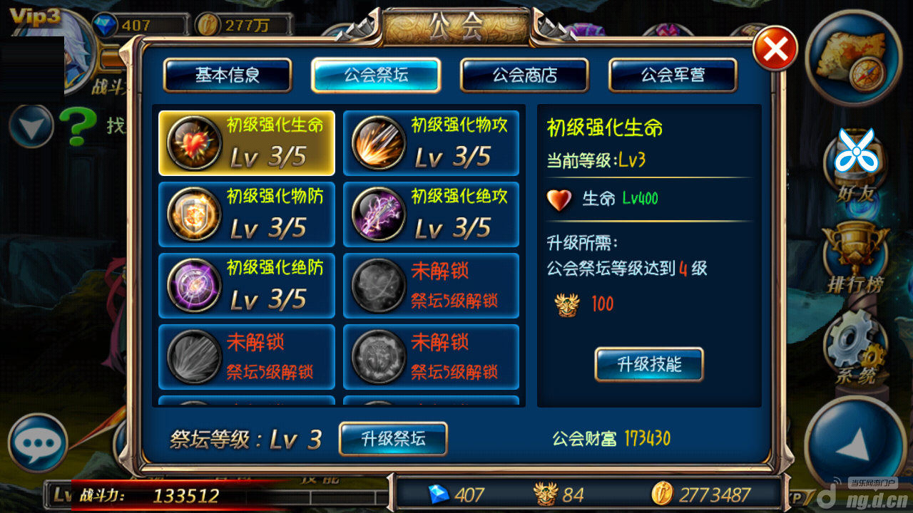 玩家或许会认为公会很没用,就加那点战斗力。加入一个好的公会,可以让你战力在同阶级的水平中更上一层楼。公会的祭坛可以升级绝攻、绝防等等属性。而且公会贡献可以购买到很多有用的东西,我建议玩家不要去玩各种之证,最好自己去打守护水晶获得。贡献先主祭坛,后主买技能书,强化石可以靠组队副本获得的!