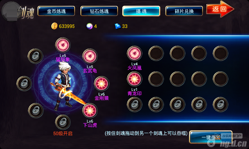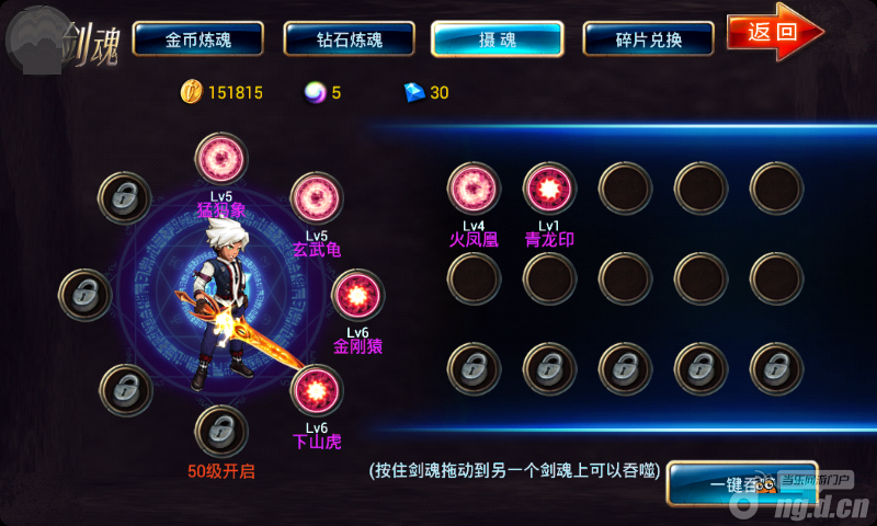 抽魂篇: 论坛有些人说,多准备点钱,晚上12点等着。这个先不做评论,我说说我的方法,是非常省时,省钱的。上线先刷几把图,然后进入剑魂用一键抽魂。①一键全是魂渣多就改用手动,亮灯不要马上点,点几下8000 再点上面的,重复两三次,上不了8万就放弃,再去刷几把图。②一键多绿有蓝就再来一次一键抽魂,不行就去刷几把图。建议抽魂不要太频繁,用这个方法40多级就能集齐你想要的。看我的图,我想要的6个留下来了,没用的已经吃了很多。