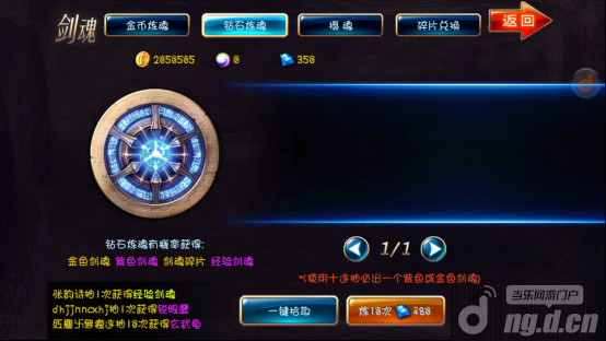 玩家可以通过金钱和钻石来获取剑魂,这个过程就叫做炼魂了。价钱越高所获得剑魂等级就会越高。剑魂有绿,蓝,紫,金。绿色的最次,而金色的最好以此类推。用金钱炼魂就很可能练出炉渣,不过炉渣还是可以回收一部分金钱的。用钻石炼魂则不会,而且钻石炼魂会练出一些等级较高的剑魂,但也不是一次两次就可以炼的到的。如果要使用十连抽还是比较有保证的。虽然这样花费的有点多。一键炼魂就用金币练成一屏幕的剑魂,比较方便。只要在金钱比较充足的情况下的。
