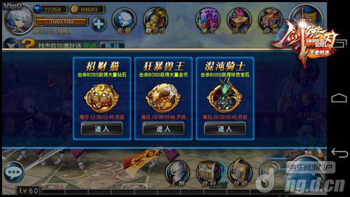 根据混沌之塔的界面UI显示,游戏模式采取很明显的逐层挑战方式,而且在进行5的倍数关卡时,奖励会有一次大的变动,此处应该会遭遇BOSS或精英怪,每日一次的免费重置与自动扫荡也设计的相当贴心,相信这一点会赢得众多玩家的赞许。世界BOSS副本也被塑造的相当完善,招财猫(10级)、狂暴兽王(30级)、混沌骑士(35级)三个BOSS针对特定等级的玩家开放,除了正常的进入副本挑战BOSS外,分别设定了玩家复活CD(可花费货币清零,花费量按梯度上升)、金币祝福(强化攻击)、输出排行榜(排行榜奖励)与单次奖励(钻石、金币、宝石等,一定几率获得英雄之证),与众多同类型活动如出一辙,只是这种以动作格斗来参与世界BOSS挑战的模式相对来说更加新颖。