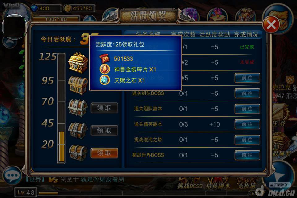 每日活动度来源主要就是组队副本、精英副本、混沌之塔、世界BOSS等等活动。每日活跃度可以领取的5个箱子,其中完成所有的活跃度可以领取到最高级的金箱,金箱奖励除了大量经验值之外,还有神兽金装碎片和天赋之石。
