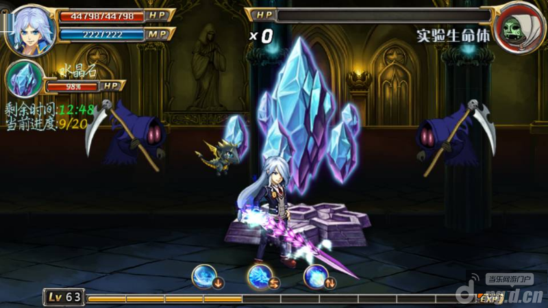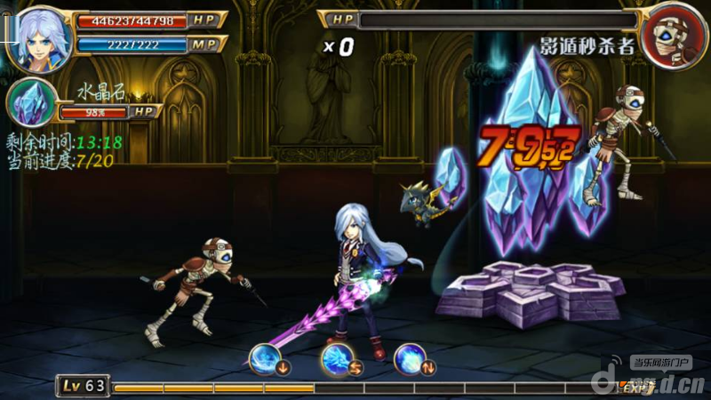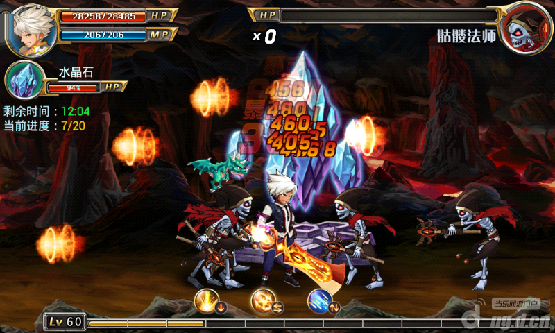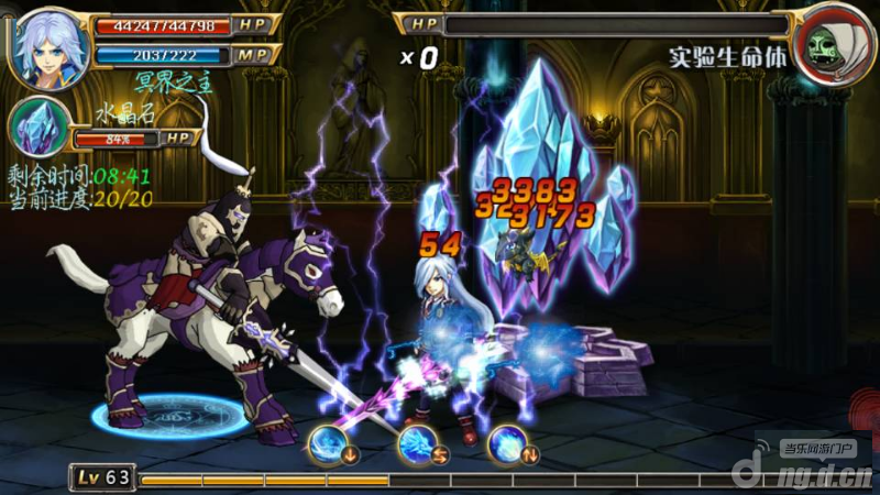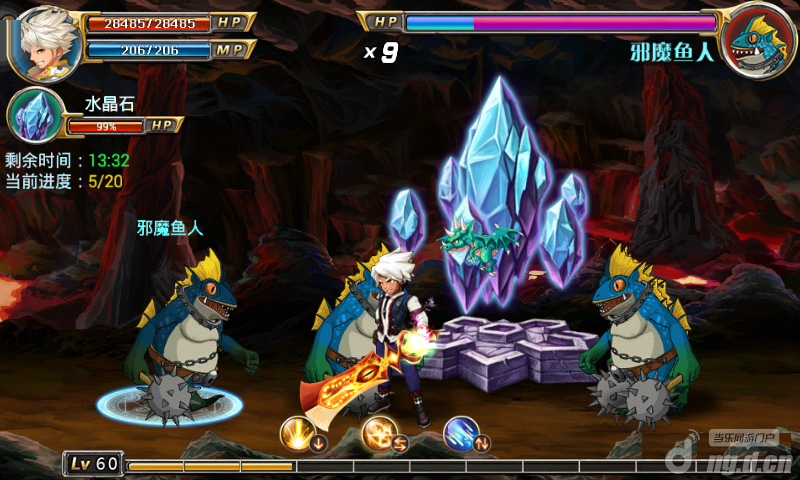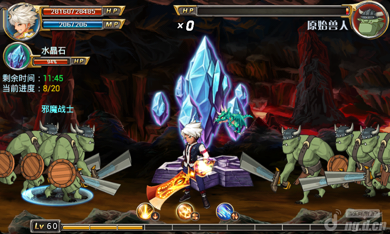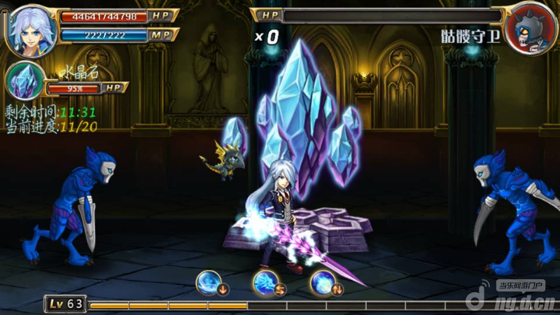 蓝狼关卡: 这种怪物是不攻击水晶的,其放技能会发光。跳跃躲过技能,用上挑击飞,挑到一堆群攻技能杀之。