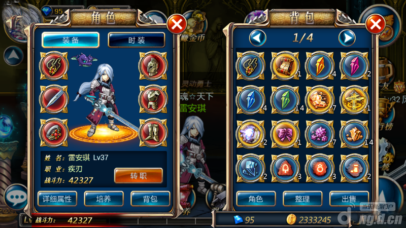 所有职业都是相同的六件,外加称号,装备分蓝,紫,金三种,另外每种都有10级,二十级,三十级,三十五级等等区分,属性差别明显,首充送的金色剑完全扯淡,十级的而已,二十级紫都强过他好多,紫色装备是游戏中的主流,而且至少四十级前绝对够用,也很好得到,金色低级的就别费那个心思了,完全没用。没用装备最好分解,会返还包括你强化失败消耗的所有强化石,所以装备大家可以放心强化,哪怕是过度装备。