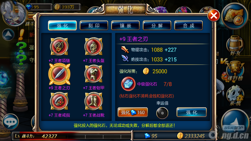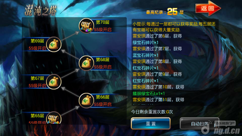 最后说下这个混沌塔,第五,十,十五,二十……七十过关可得宝石,其他层得宝石碎片,十个相同碎片得一个宝石,这里过关获得的全部都是随机宝石或者碎片,这也是获得宝石的重要途径,(哎,想到这个就蛋疼,这尼玛根本就不可能凑够顶级宝石嘛)