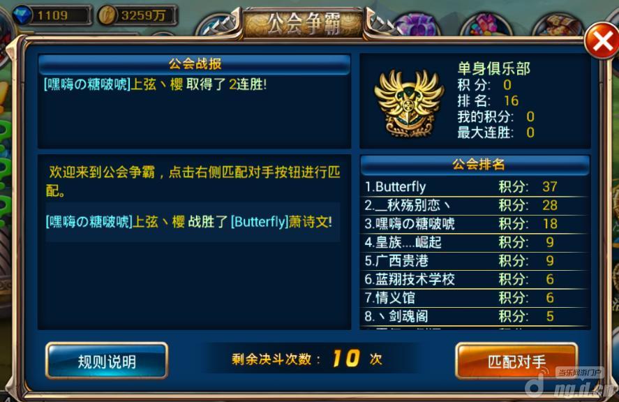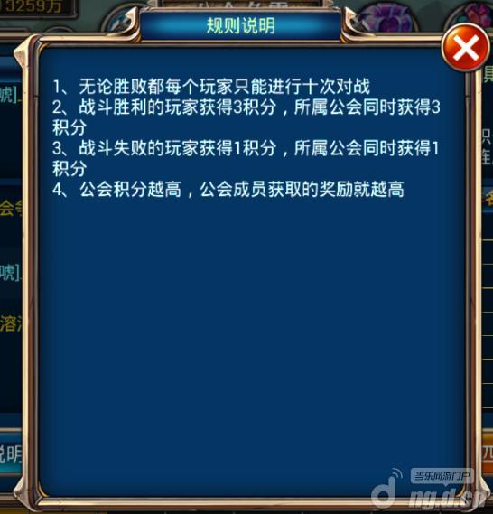 现在为各位伙伴介绍下公会争霸赛的规则哦,首先呢,无论胜败每个玩家都只能进行十次对战,战斗胜利的伙伴可以获得3积分,所属的公会也会获得3积分,那么战斗失败的伙伴会获得1积分,所属公会也将获得1积分,公会的积分越高,公会成员的奖励就会更多哦!