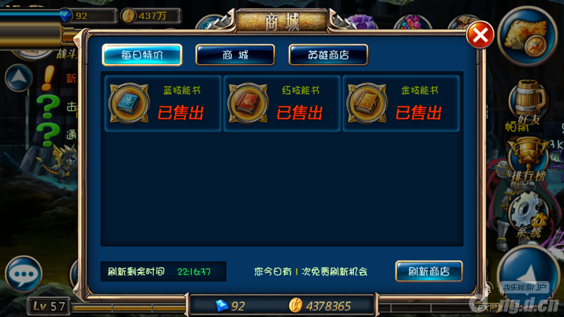 每日特价这栏必看,如果你有至尊月卡,每天120钻,你看到技能书的话,不用想,买下来,特价是绿2钻,蓝6钻,红24钻,金120钻,这都不买下的话你技能遥遥无期。如果没有,120钻直接买绿书40本,自己合,这虽然麻烦,但是只需180钻一本金书,还有守护水晶有十来个钻(我打的是爆55证的,32钻)