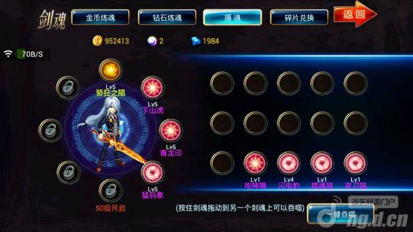 剑魂:名字都是剑魂之刃,剑魂的作用顾名思义,非常重要,剑魂分4种。金色,紫色,蓝色,绿色。金色剑魂非常难搞,并不是说抽多少砖石就是能出的,我们区有个土豪,想弄个潮汐,充了628,都没有抽出来,而楼主只是在玩的第二天就出了骄狂之陨,还是拿50钻单抽得到的。
