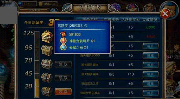 目前已知的装备方案是通过每日活跃度奖励与挑战BOSS获得,最高奖励获得125活跃度兑换神兽金装碎片,然后进行合成随机开启宠物某一个装备。不过目前看合成价格来看,目前有点坑!
