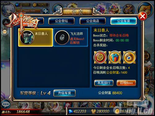公会BOSS战:公会将作为《剑魂之刃》历来新版本的重点更新项目,此次公会BOSS玩法亦如此。公会升级军营后可解锁更多的BOSS副本,由会长选择BOSS进行召唤。完成召唤后,公会所有成员可以进入副本进行公会进行BOSS战。