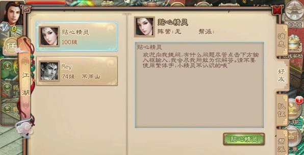 在好友界面,有一个贴心精灵,当你遇到不懂的问题,除了到论坛咨询外,还可找精灵咨询哦!