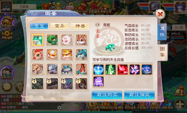 根据游戏的设定,想要获得宠物可以通过两种形式,一种是商店购买:宠物商店出售的是宝宝类型的宠物;一种是野外捕捉:野外捕捉会有几率捕获到带天技的宝宝;