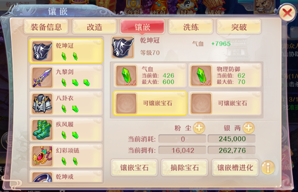 每件装备有4个镶嵌槽,各镶嵌槽随装备等级开启,当装备等级达到:45、55、65、75级时依次开启各镶嵌槽;玩家可通过突破来开启装备镶嵌栏位,从而提升角色属性;