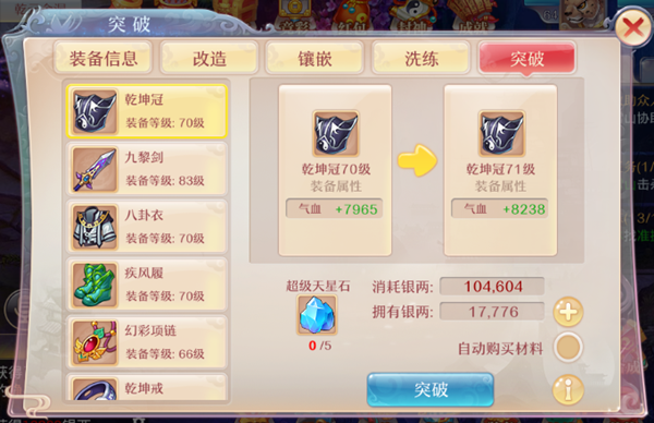 举例:角色为28级,装备最高可突破至48级装备;进行装备突破后,当角色从28级提升到38级时,装备等级不变,但装备突破等级上限提升到58级,装备等级可从48级突破至58级。装备突破时将会消耗超级天星石以及银两,并且有几率失败。