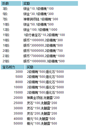 新玩家进入新服后14天内,经脉,宝石达到指定要求即可领取丰厚奖励!