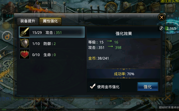 属性强化需要消耗强化石,强化石不足时可用金币强化,强化后可大大提升人物属性,人物的战斗力也会有大大的提高。