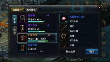 新手可以先升级武器和服装,如果是妖猴则要升级武器和戒指。前期吸纳掉落的装备就足够,建议尽量不要吸纳装备精魄升级,除非关卡实在过不了。装备精魄尽量多地留到后面橙色装备的升级。