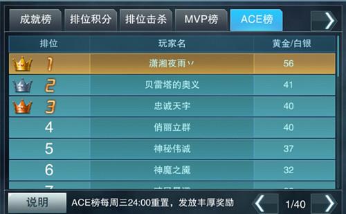 以玩家在所有模式的战斗中获得的ACE数高低进行排名,每周三24:00将ACE榜每周奖励发至邮箱,并清零本周榜单数据。