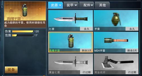 《枪战英雄》中,常规手雷有3种,普通、高爆、M24手雷,依照手雷的杀伤力和杀伤范围给它们排队,分别是高爆>M24>普通手雷.高爆手雷杀伤力为120,范围17,这意味着要是把它放在对手“半臂”范围内,可以直接送他上西天。