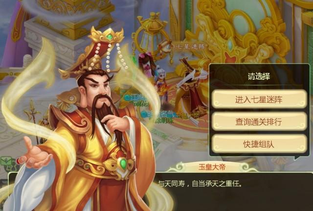 每周三晚上 20:00-20:40,玩家等级达到40级,即可在凌霄宝殿 与 玉皇大帝 进行对话,开启多人组队PVE副本“七星迷阵”。 组队规模为3-5人,不足5人可上伙伴。