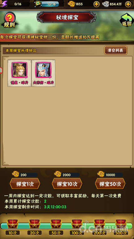 2.每周探宝次数达一定标准,可领取对应的宝箱;
