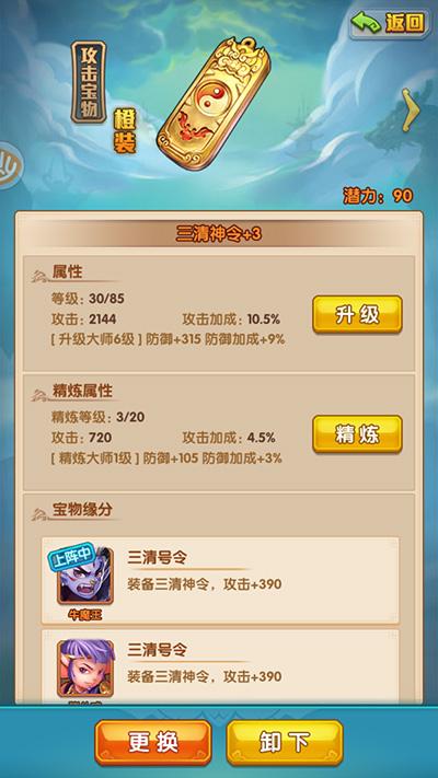 当获得多个相同的宝物时,可以通过【宝物精炼】提升精炼品阶。经过精炼后的宝物能够大幅提升攻击和攻击加成增益。