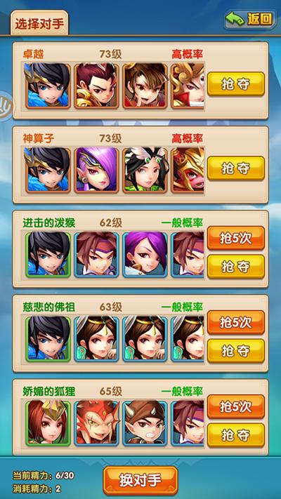 在《少年西游记》中,少年们想要更多更强宝物的话,就要通过【冒险】界面中的抢夺玩法获取宝物碎片和经验宝物碎片。点击缺失的碎片后将出现【选择对手】的界面,此时即可消耗2点精力,选择抢夺的对象进行PK。一般来说,战胜越强大的对手,获得碎片的概率也越高。