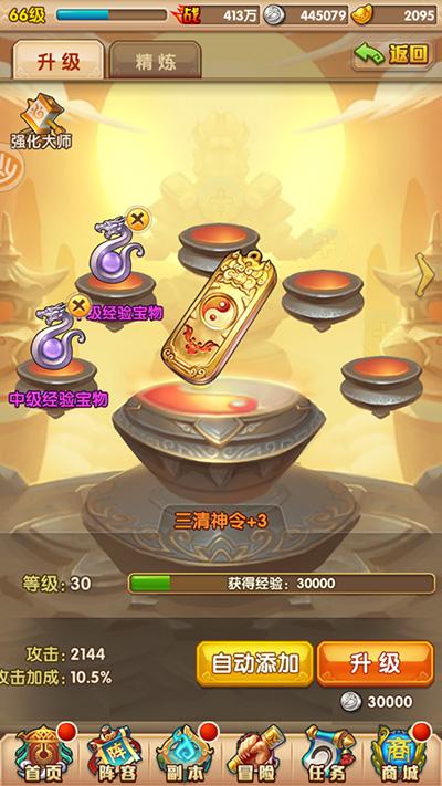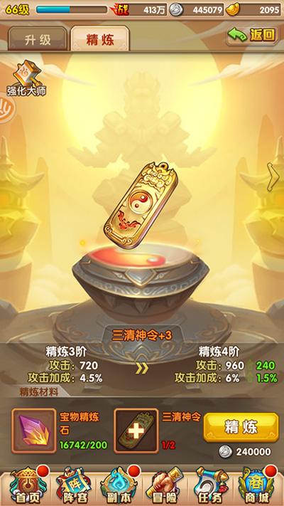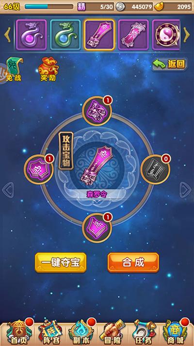 当集齐宝物或经验宝物的四种碎片时,即可合成为一个完整的物品。在【宝物】中点击指定宝物,即可对其进行【升级】和【精炼】操作。【宝物升级】时需要的材料除了抢夺外,还可通过日常副本中获得。