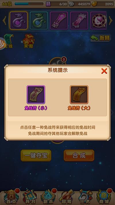 在进行【抢夺】玩法时,被抢夺的一方面临着失去宝物碎片的风险。此时若开启【免战】功能,即可避免宝物碎片被他人抢夺。小免战符可免战2小时,大免战符可 免战8小时,值得注意的是,免战期间,如果主动抢夺其他玩家将会解除免战状态。少年们当获得橙色宝物碎片时,不妨适当开启免战功能哦!