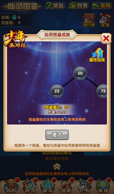 《少年西游记》中,当点亮【仙灵图鉴】时可对全体神将产生增益。而在新版本中,神将的增益将得到进一步的提升。少年们在点亮图鉴的同时,将 获得与仙灵数值相同的【图鉴值】,当【图鉴值】达到指定的额度时将激活【仙灵成就】。【仙灵成就】提升的属性将对全体上阵神将生效,为少年们提供更强大的 战力!