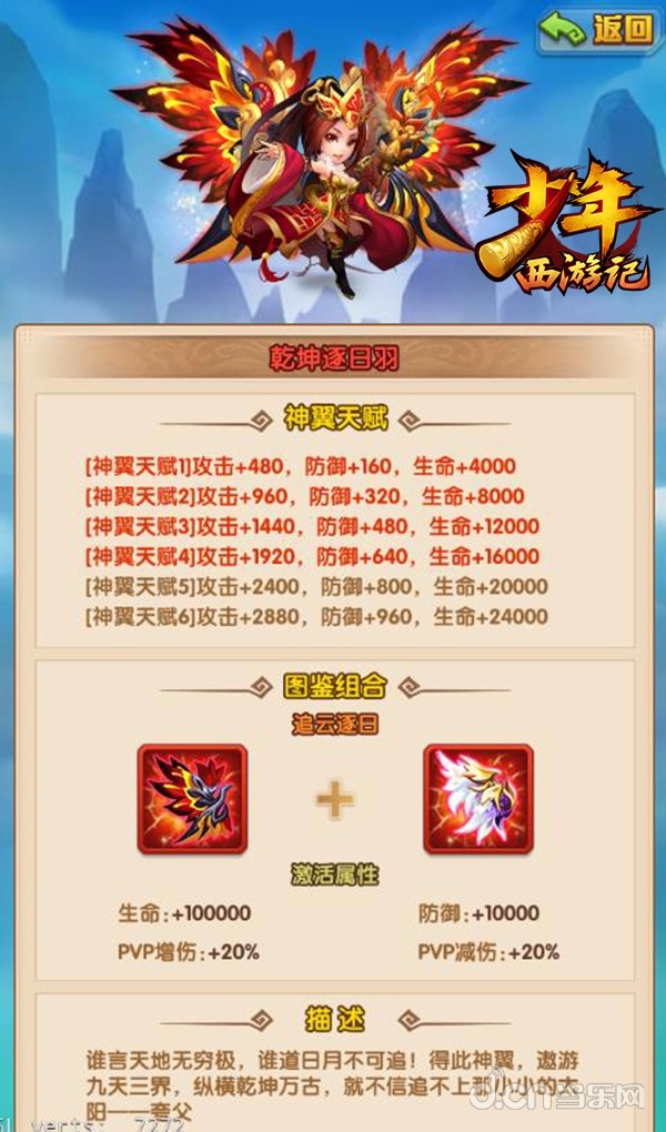 “乾坤逐日羽”是攻击向神翼,同时还是图鉴“追云逐日”的重要组成部分,激活该图鉴后,还可以获得PVP攻击和抗性增幅,提升少年们在PVP战场的竞技能力。
