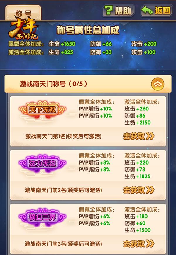 当少年们在【激战南天门】中拿到指定名次时,即可激活对应的称号。激活后的称号可为全体神将加成攻击、防御和生命三项属性。值得一提的是,所有激活称号带来的属性加成可完美叠加,让少年的神将们威风凛凛无坚不摧!