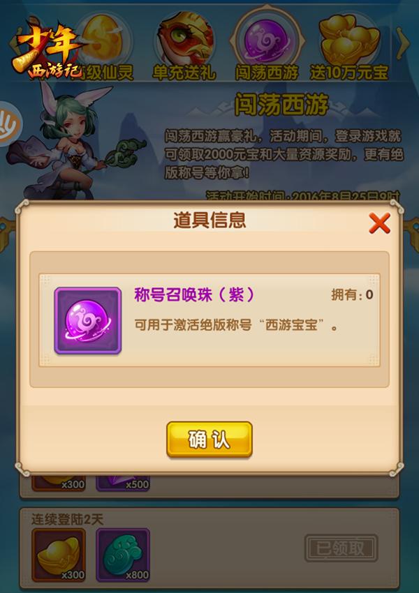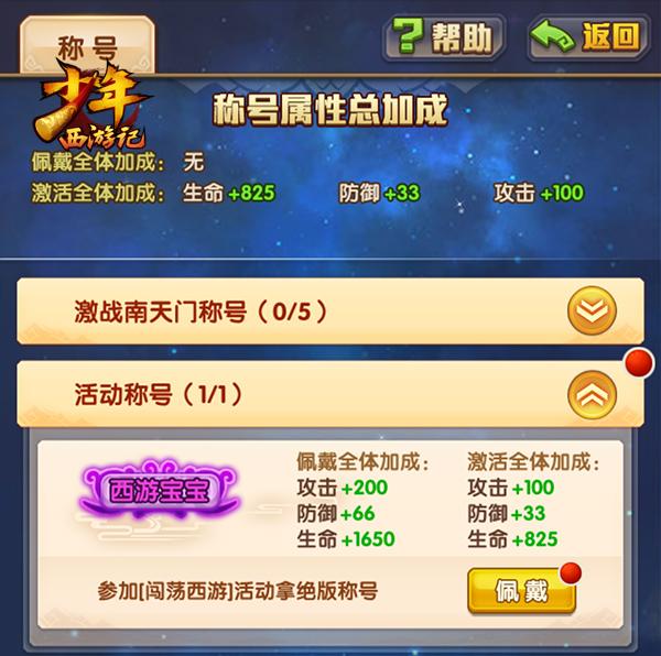除了“激战南天门称号”外,少年们还可通过参加游戏活动,获得“活动称号”。目前《少年西游记》中开放了“闯荡西游”活动,活动期间,登录游戏即可获得2000元宝,更有绝版称号“西游宝宝”等你拿哦!