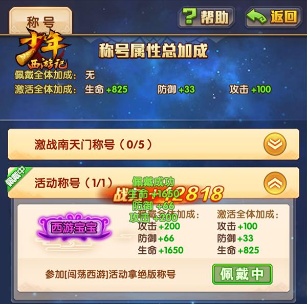 在《少年西游记》的中,当激活称号后便可进行佩带。“佩带”和“激活”相同,均可获得若干属性加成;不同的是,同一时间少年只可“佩带”一个称号,并获得这个称号的“佩带属性加成”。