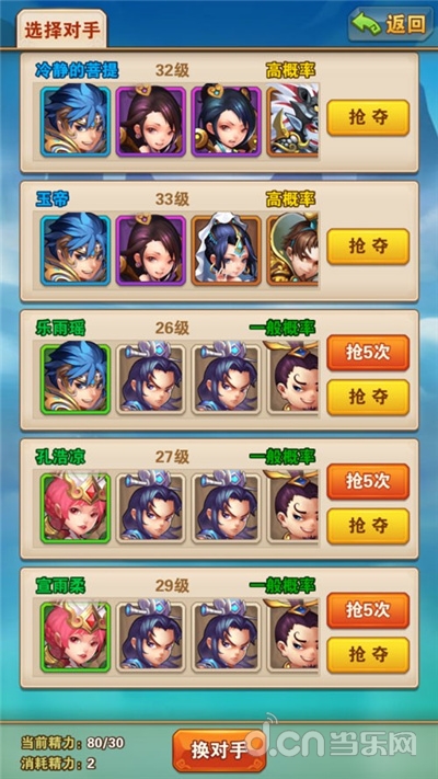 2、夺宝时会有被夺玩家列表,并显示抢夺各个玩家的成功率,该概率分为较高、高、一般、较低、低,但是宝物碎片品质越高,成功率则越低。小编推荐大家选择概率高,且等级不能比自己高太多的号抢夺,这样,既保证能够打败对手不浪费精力,又能保证抢夺到宝物。