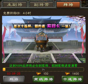 副将系统跟随武将品质开启,玩家拥有红将以后,即开启副将系统。玩家可以通过拜将功能来对副将进行招募,拜将分为三种:免费拜将、高级拜将、十连拜将。每次拜将后,均可累积幸运值,当幸运值达到100%后,下次拜将必出紫将。