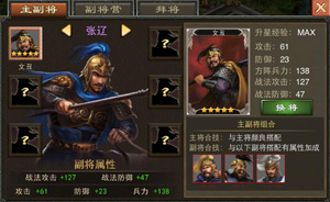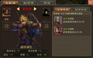 通过武将装备栏进入副将界面。副将栏数量和武将品质、等级有关。副将品质可分为黄、红、紫,品质越好的副将属性越高。副将卡装备到武将身上后,会把副将的属性直接加成到主将属性中。